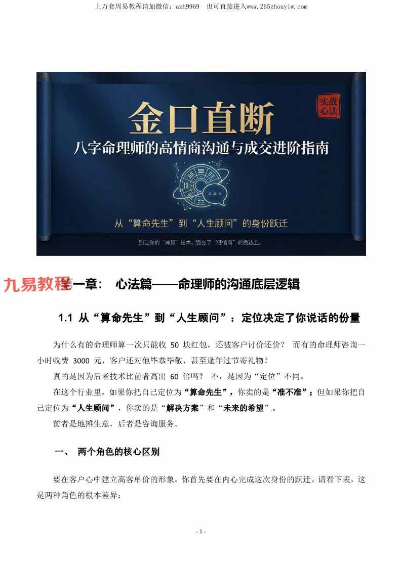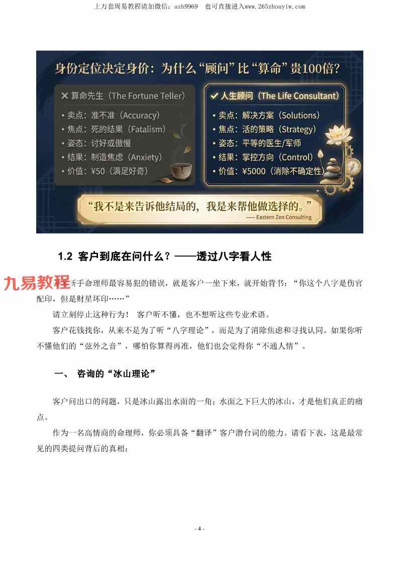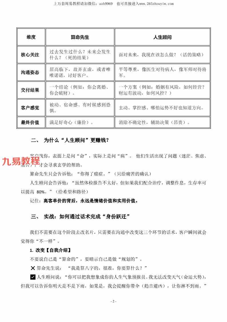 八字命理师的高情商沟通与成交话术全案【原版】pdf 64页,讲解命理咨询当中的一些高明话术和提高单价和转化率的方法。